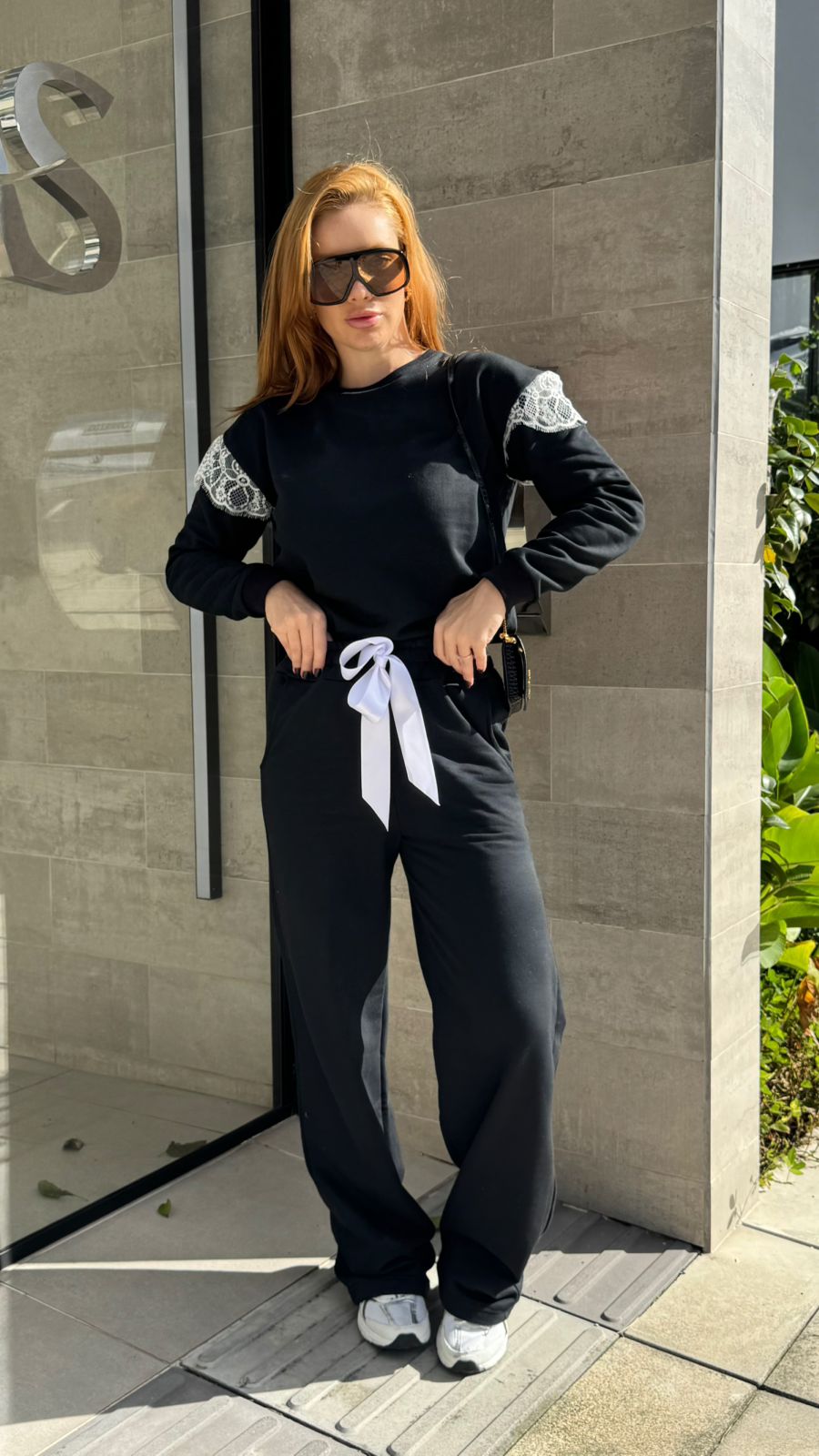 A calça também é confeccionada em 100% algodão, oferecendo conforto e liberdade de movimento. A modelagem pantalona cria um visual moderno e elegante, enquanto o elástico na cintura proporciona ajuste confortável ao corpo. O cós recebe um delicado detalhe em fita de cetim, e os bolsos faca trazem praticidade ao dia a dia.
