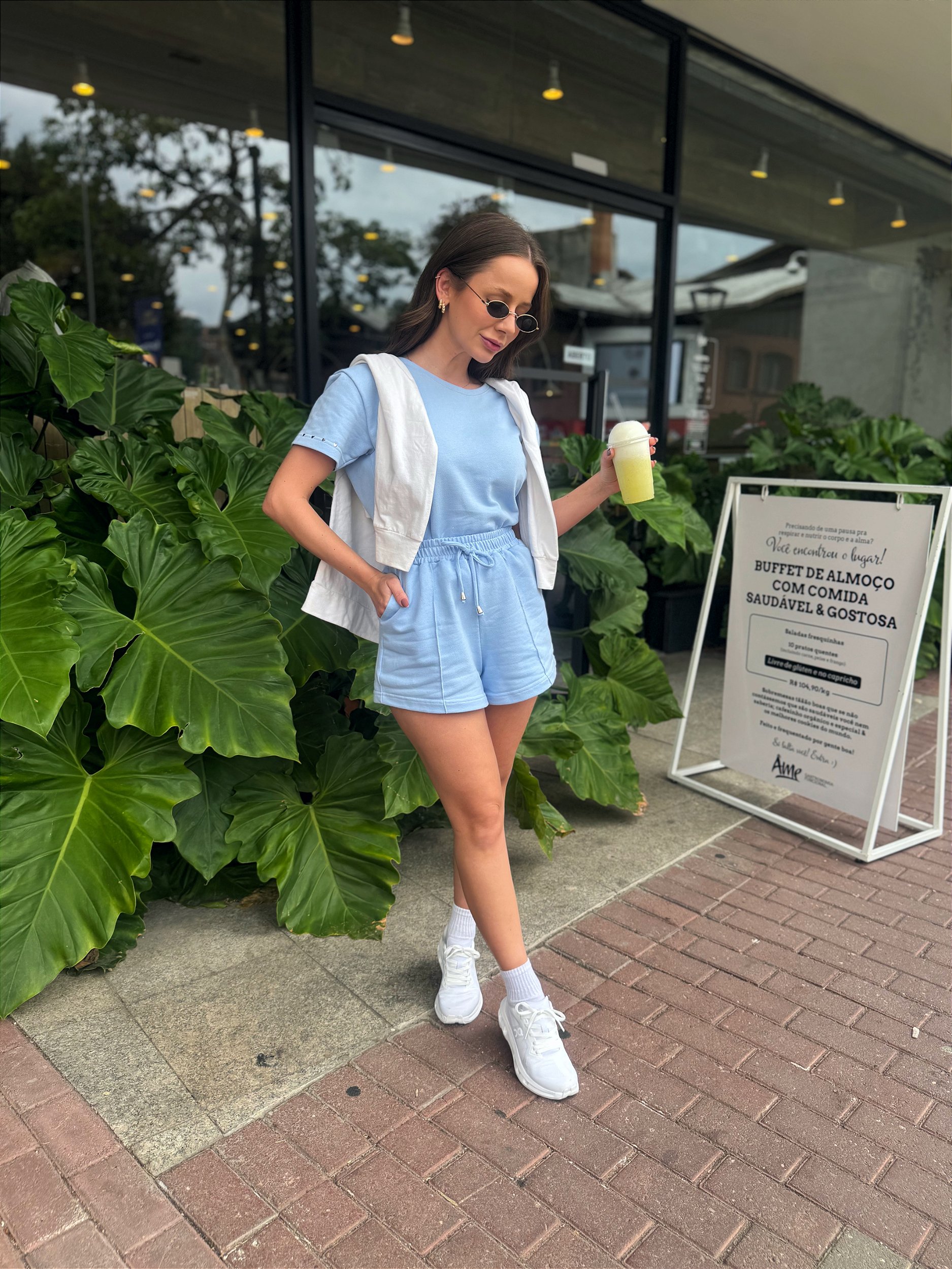 A T-shirt com modelagem mullet traz um visual moderno e os detalhes termo colantes nas mangas adicionam brilho sutil e personalidade. Já o short cintura alta conta com cós elástico, bolso faca e friso frontal — garantindo ajuste perfeito e um toque de elegância até nas produções mais casuais.